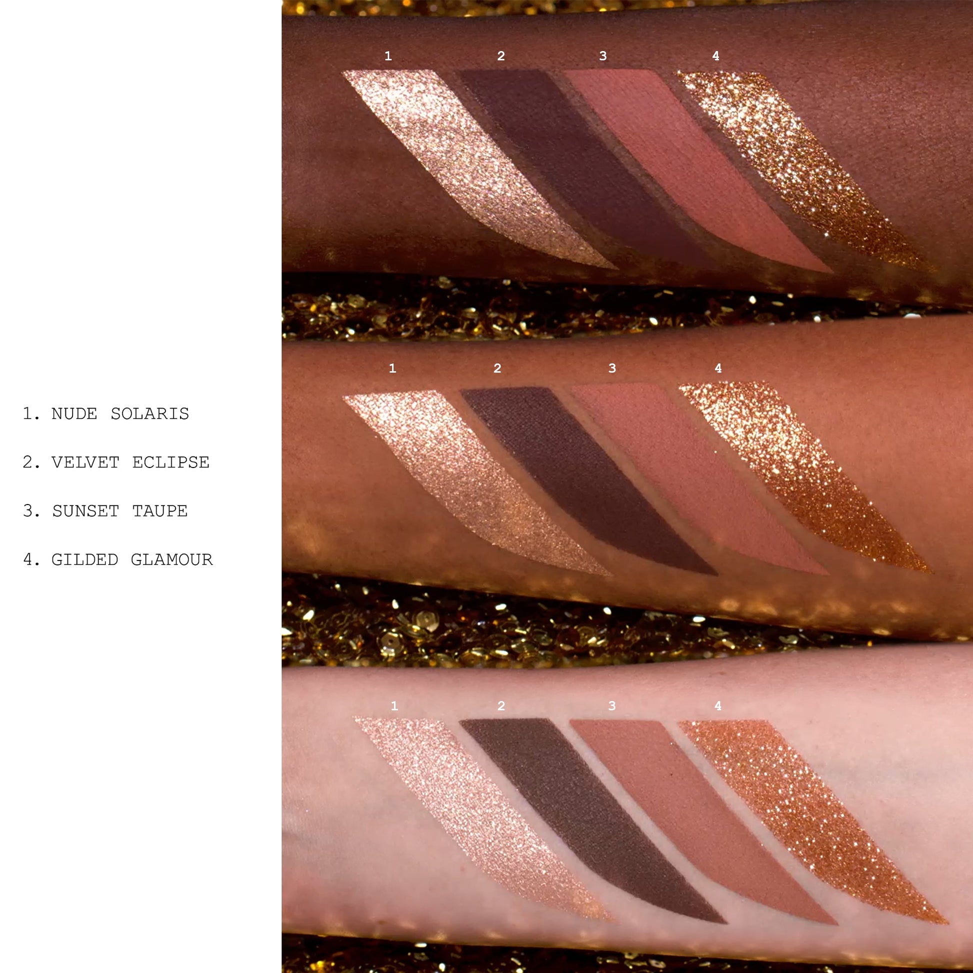 Introduce el epítome del lujo y el brillo en tu colección de maquillaje de ojos con Divine Bronze Luxe Quad: Venusian Sunrise.