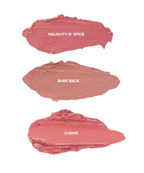 - 3 x 0,07 oz/ 1,8 g de colores de rubor Mini Nudies Matte para todo el rostro en Naughty N’ Spice (rosa profundo neutro), Bare Back (rosa desnudo neutro), Cherie (rosa coral desnudo neutro)