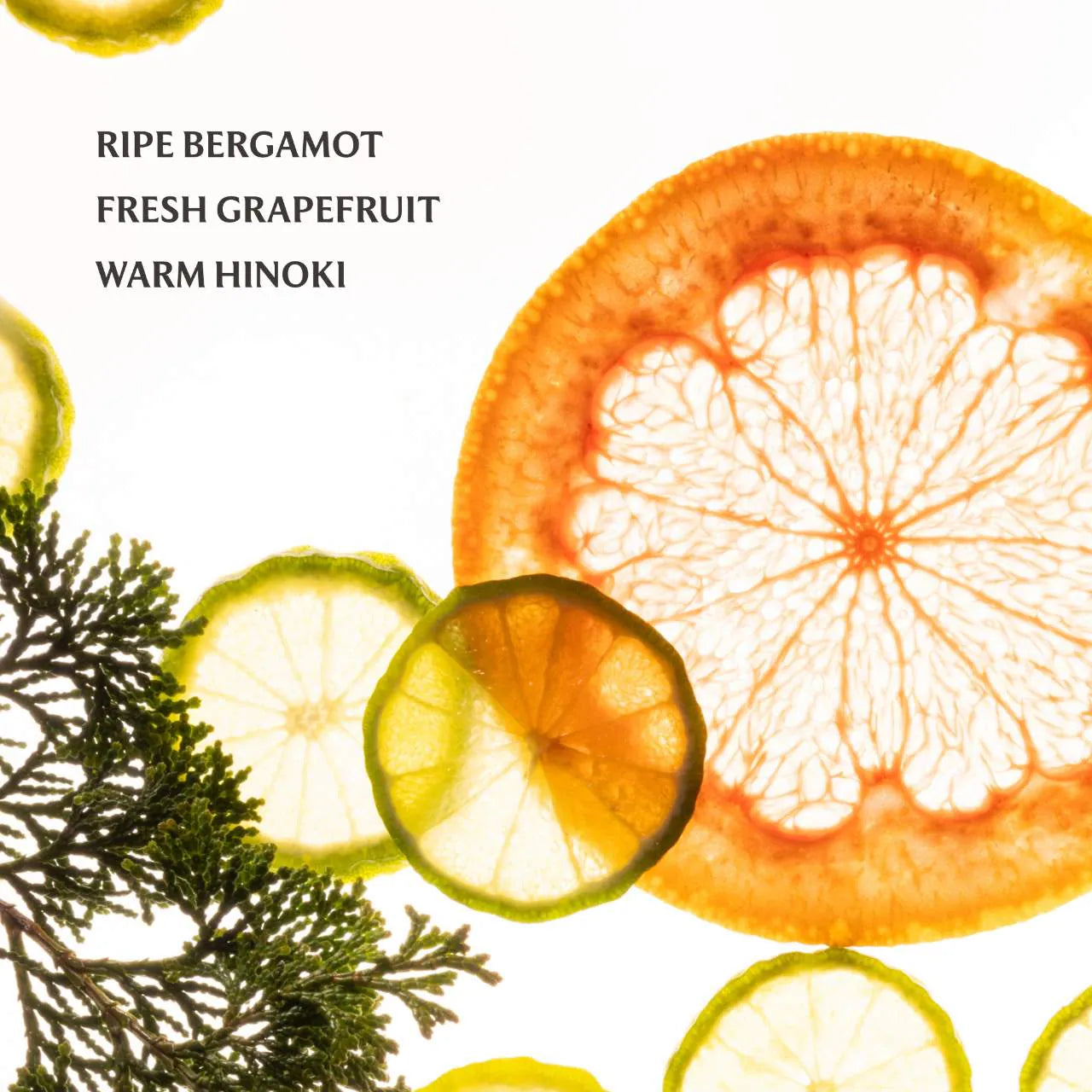 Descripción de la fragancia: Elegante y serena con un toque de energía. La vibrante bergamota y el pomelo revitalizan, mientras que la madera de hinoki aporta una calidez relajante.